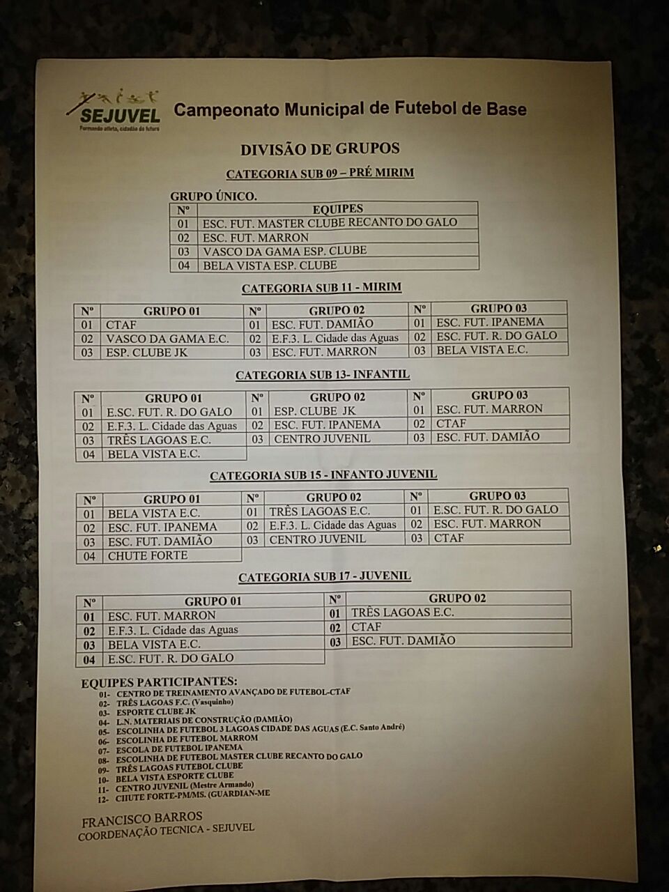 A secretaria de Esporte, Juventude e Lazer (SEJUVEL) deu inicio, no último domingo (29), ao Campeonato Municipal de Futebol de Base “Professor José Mariano Nunes Filho” com as categorias sub 9, sub 11, sub 13, sub 15 e sub 17.