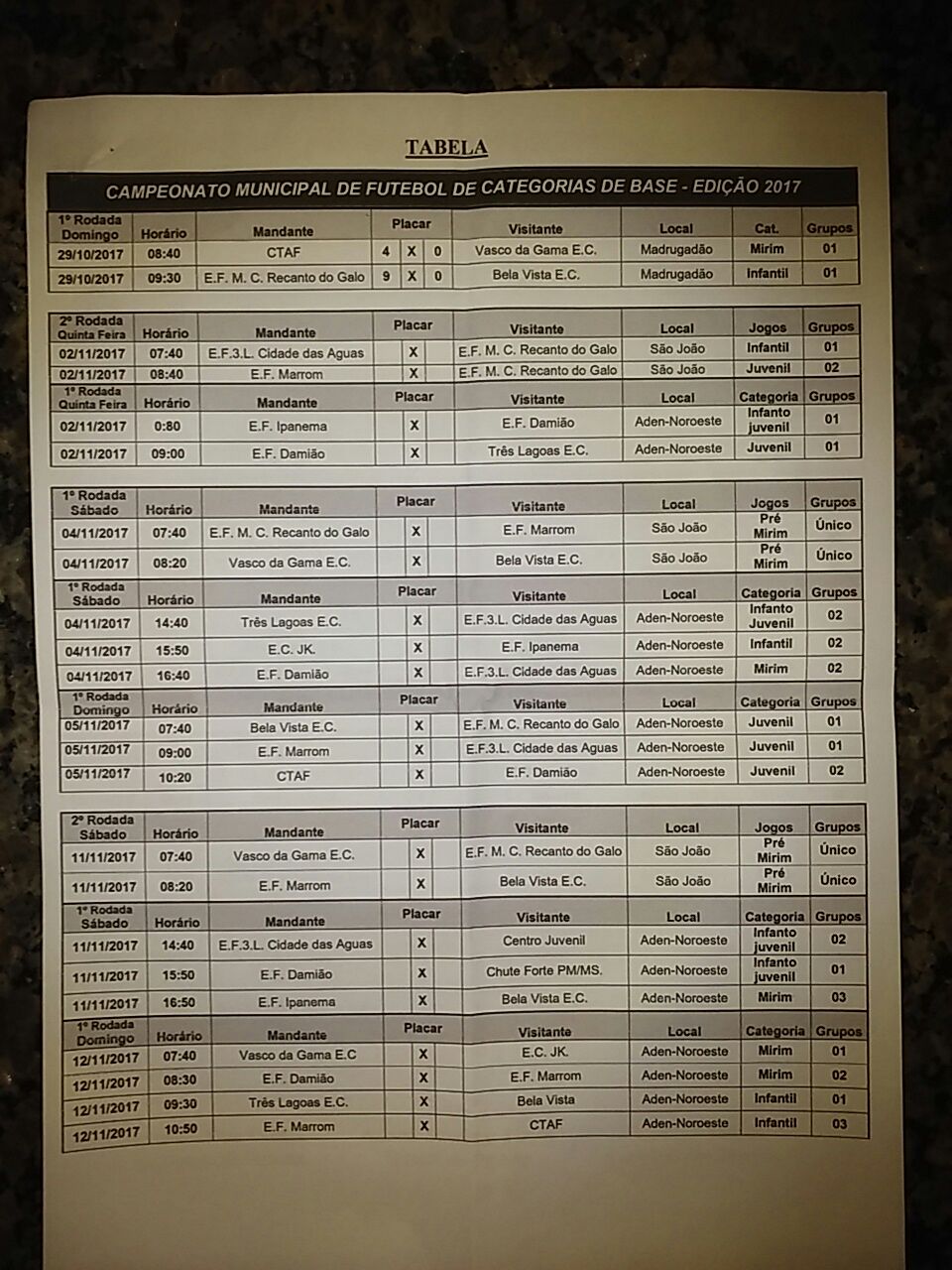 Os primeiros jogos da competição aconteceram ainda na manhã de domingo. Na categoria mirim (sub 13), o time do CTAF venceu o Vasquinho por 4 a 0, já no infantil (sub 15) o Recanto do Galo aplicou uma goleada de 9 a 0 contra o Bela Vista.